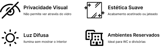 Vidro com acabamento acetinado obtido por tratamento a ácido, que lhe confere um aspeto translúcido e elegante. Ideal para quem procura privacidade com passagem de luz, sendo muito usado em divisórias, portas interiores, móveis e elementos decorativos.